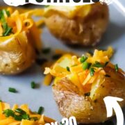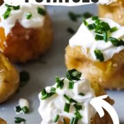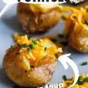 Baked Mini Potatoes are a quick and simple appetizer or finger food for holidays, parties and special occasions. Make them in the oven or air fryer. Either way, they turn into crispy roasted mini potatoes with a delicious creamy inside. Top with yummy baked potato fixings, like sour cream, cheese, bacon bits, and chives or your favorites!