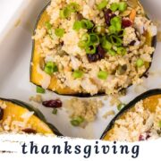 Festive, warm, and colorful, this sweet and savory Stuffed Acorn Squash recipe is easy to make, filling, and is perfect for the upcoming holiday months and cooler season.